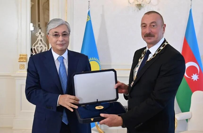 “在哈萨克斯坦,您作为杰出的政治家而广为人知并受到尊重。与此同时,作为使阿塞拜疆取得历史性胜利,并按照联合国安理会决议恢复其领土完整的人,我今天在我们的个人会议上向你表示了祝贺。您为两国双边和多边合作关系发展做出了巨大贡献。我代表全体哈萨克斯坦人民向您颁发金鹰勋章。”托卡耶夫说。
