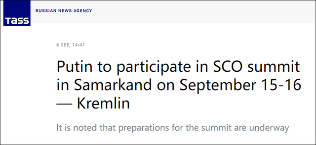 据俄罗斯塔斯社近日报道,俄罗斯总统新闻秘书佩斯科夫表示,普京将参加9月15日至16日在乌兹别克斯坦撒马尔罕举行的上海合作组织峰会。