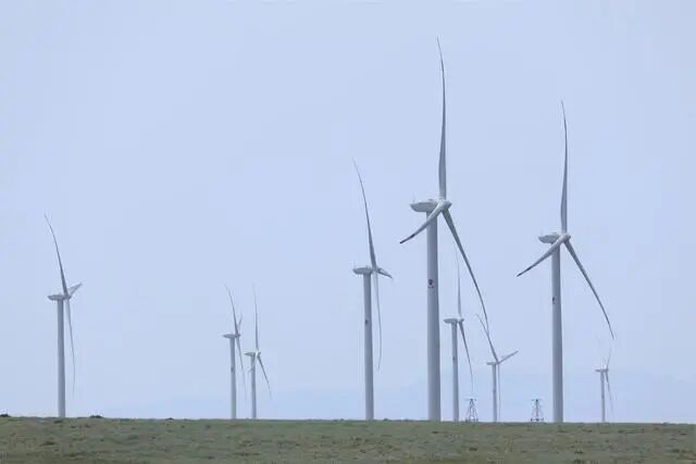 这是2021年5月24日在哈萨克斯坦扎纳塔斯拍摄的风电场的风机。新华社发(奥斯潘诺夫摄)