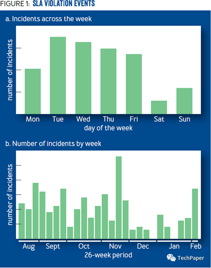 图 1a 显示了周六和周日发生的事故是如何大幅减少的,尽管网站的流量在整个一周内保持一致。图 1b 显示了在六个月的时间里,只有两个星期没有发生事故:圣诞节的那一周和员工要为对方写同行评论的那一周。