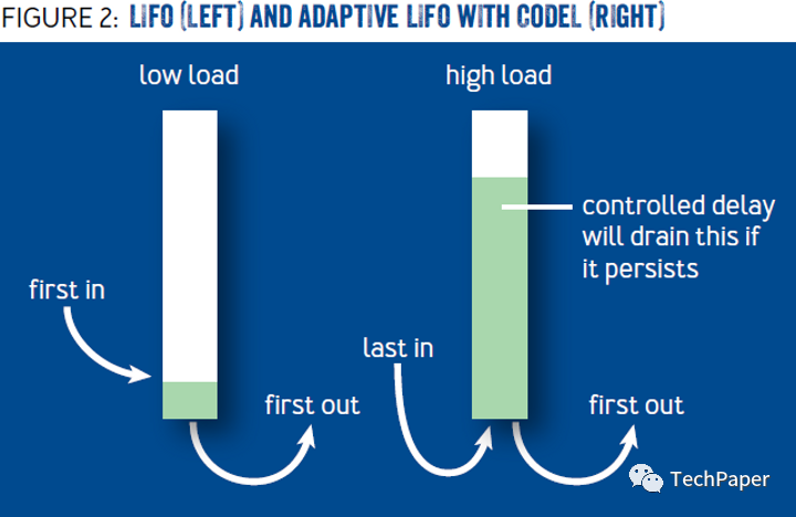 在这个算法中,如果队列在过去的 100ms 内没有被清空,那么在队列中花费的时间被限制在 5ms。如果服务在过去的 100ms 能够清空队列,那么在队列中花费的时间被限制为 100 ms。这种算法可以减少排队(因为 lastEmptyTime 是在遥远的过去,导致 5ms 的排队超时),同时允许短时间的排队以达到可靠性的目的。虽然让请求有这么短的超时似乎有悖常理,但这个过程允许请求被快速丢弃,而不是在系统无法跟上传入请求的速度时堆积起来。较短的超时时间可以确保服务器接受的工作总是比它实际能处理的多一点,所以它永远不会闲置。