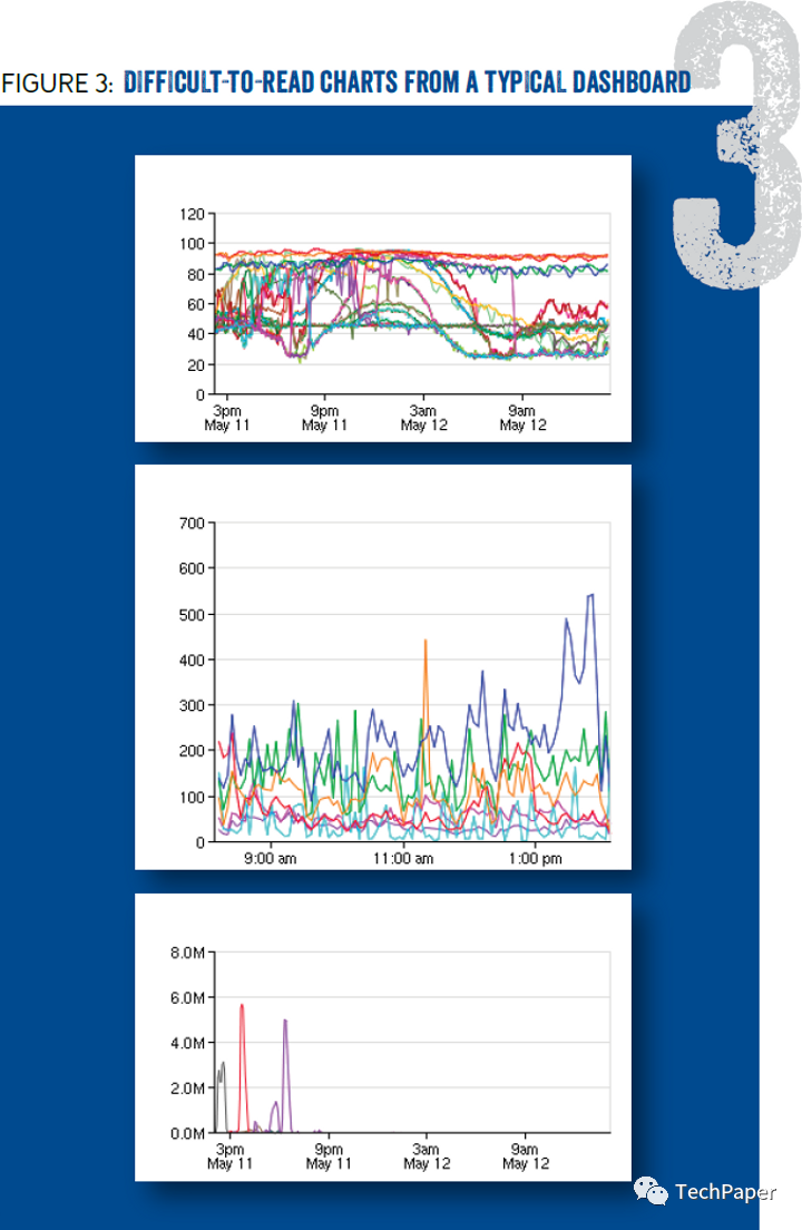 使用 Cubism 的高密度仪表板在处理事故时,快速获取信息很重要。好的仪表盘可以让工程师快速评估可能出现异常的指标类型,然后利用这些信息来推测根本原因。然而仪表盘会越来越大,直到难以快速浏览,这些仪表盘上显示的图表有太多线条,无法一目了然,如图3所示。
