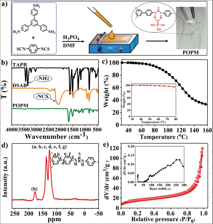 图1-a) POPM的准备示意图。b) TAPB、DSAB和POPM的FTIR光谱。c) POPM在不同温度范围的TGA曲线。d)固体13C NMR谱和e) POPM‐干凝胶的N2吸附等温线;插图为孔径分布。