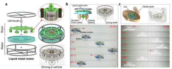 图4 液态金属电机(a)液态金属电机结构图;(b)和(c)液态金属电机驱动的小车和小船;