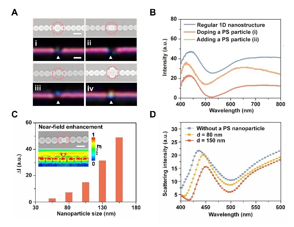 纳米颗粒、病毒、蛋白质等纳米尺度物体的可视化检测在自组装、纳米材料表征、化学合成以及生物医学诊断等领域具有重要应用价值,特别是新冠病毒大流行下,急需一种快速、居家、准确的检测手段。传统的光学显微镜由于衍射极限很难直接分辨200 nm以下的物体。荧光显微成像技术虽然分辨率高,适用于观察生物样品,但是需要复杂的荧光标记,且存在光漂白等问题,广泛应用受到限制。因此,开发简单、低成本、易操作的新型纳米光学检测方法具有重要意义。近日,中科院化学研究所绿色印刷实验室宋延林研究员课题组和复旦大学石磊教授合作在《Matter》期刊上发表了题为“Self-assembled 1D nanostructures for direct nanoscale detection and biosensing”的论文(DOI: 10.1016/j.matt.2022.03.013)。论文第一作者是张泽英,共同第一作者是赵茂雄,通讯作者为宋延林研究员和苏萌副研究员,该研究得到了科技部、国家自然科学基金委、中国科学院、北京市科委和北京分子科学国家研究中心的支持。研究团队利用纳米绿色印刷技术制备了在可见光区域具有独特光学共振响应的一维纳米结构,能够显著放大纳米尺度物体的光学信号,突破传统的光学衍射极限。当纳米物体结合在一维纳米结构上,利用传统的光学显微镜甚至手机可以直接看到单个小至50 nm的物体,实现了无标记、可视化地检测单个纳米颗粒、纳米缺陷等。进一步利用简单的表面修饰,该方法可应用于实时检测、计数测量生物体液环境中的病毒颗粒,在超灵敏病原体检测方面具有很大优势。相比于以往报道的纳米尺度光学检测方法,该方法操作简单、成本低、可便携,且广泛适用于多种纳米材料,在重多领域具有广泛的应用前景。