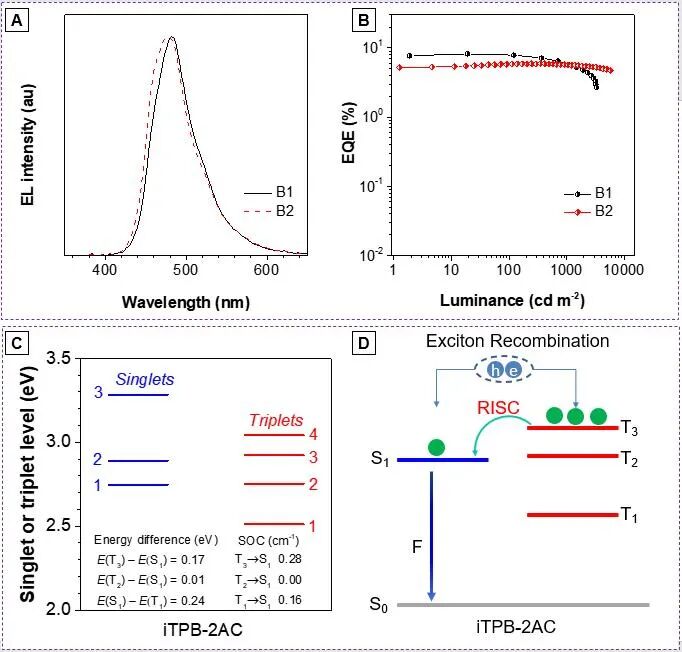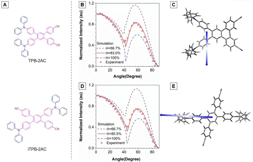相比于传统的发光技术,有机发光二极管(OLED)具有自发光、快响应、柔性透明等优点,在白光照明和全彩显示领域展现了巨大的应用前景。目前,红绿光OLED主要基于磷光材料,而蓝光OLED是荧光材料。然而,由于激子利用率和器件稳定性的制约,高效且稳定的蓝光OLED仍然短缺。此外,上述材料不可避免的聚集导致发光猝灭效应,往往需要以精确的浓度掺杂到合适的主体里以避免发光猝灭。掺杂使得器件制备复杂化,并且器件发光层使用中可能存在相分离的问题,从而极大降低器件效率,限制其实际的应用。
