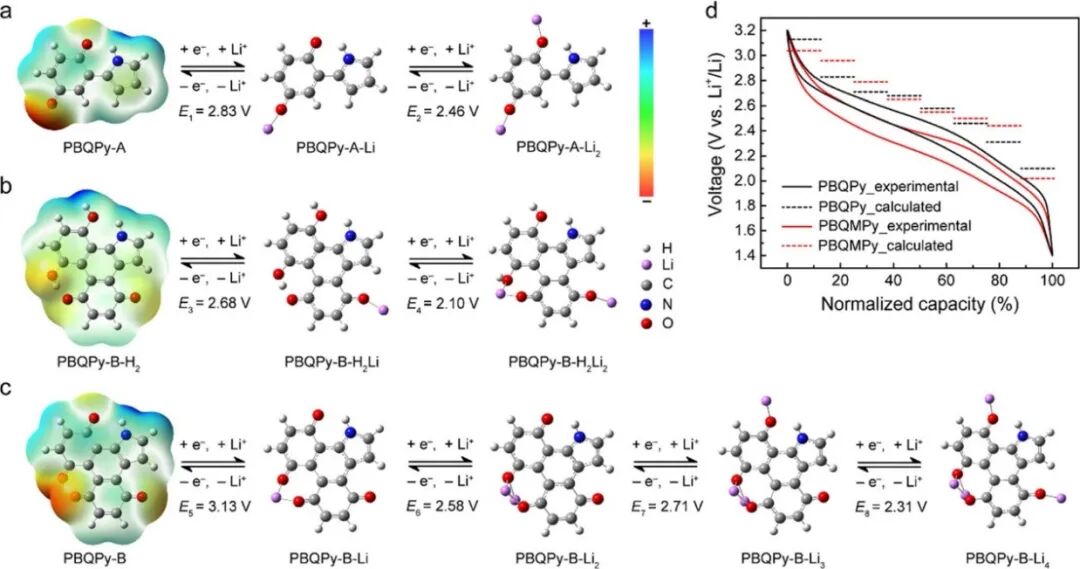 图4. 通过DFT计算获得的(a)PBQPy-A、(b)PBQPy-B-H2和(c)PBQPy-B三种电化学活性单元的反应机理与氧化还原电位,以及(d)PBQPy和PBQMPy的氧化还原电位计算值与实际充放电曲线的对比