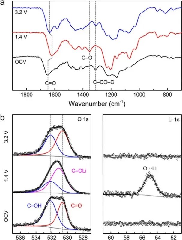 如图5所示,作者以PBQPy为例,对不同充放电状态[初始态(OCV)、放电态(1.4 V)、充电态(3.2 V)]的电极进行了非原位FTIR和XPS表征。两种表征方法均证实了PBQPy基于醌基(C=O)与其酚锂盐(C–OLi)之间高度可逆反应的充放电机理。此外,XPS谱还表明PBQPy中残留的酚羟基(C–OH)在充放电过程中十分稳定,并未发生H+–Li+离子交换与电化学氧化。