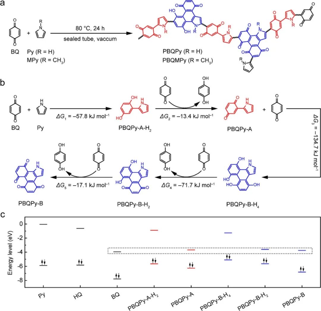 如图1所示,将苯醌(BQ)和吡咯(Py)或1-甲基吡咯(MPy)在80 ℃下真空封管反应24小时即可合成目标聚合物PBQPy或PBQMPy。以PBQPy为例,作者结合文献报道与DFT计算分析了材料的合成反应机理与分子结构,认为在聚合过程中先后生成了线型的A单元和环状的B单元,并且BQ同时作为单体和氧化剂参与反应。各步反应的吉布斯自由能变化值均为负数,表明聚合反应在热力学上是自发的,因此不需要太高的反应温度即可发生。在各种可能的结构单元中,PBQPy-A、PBQPy-B-H2和PBQPy-B三者的LUMO能级比较接近,因此在PBQPy分子中共存的可能性较大(少量单独的BQ单元可能作为端基存在)。