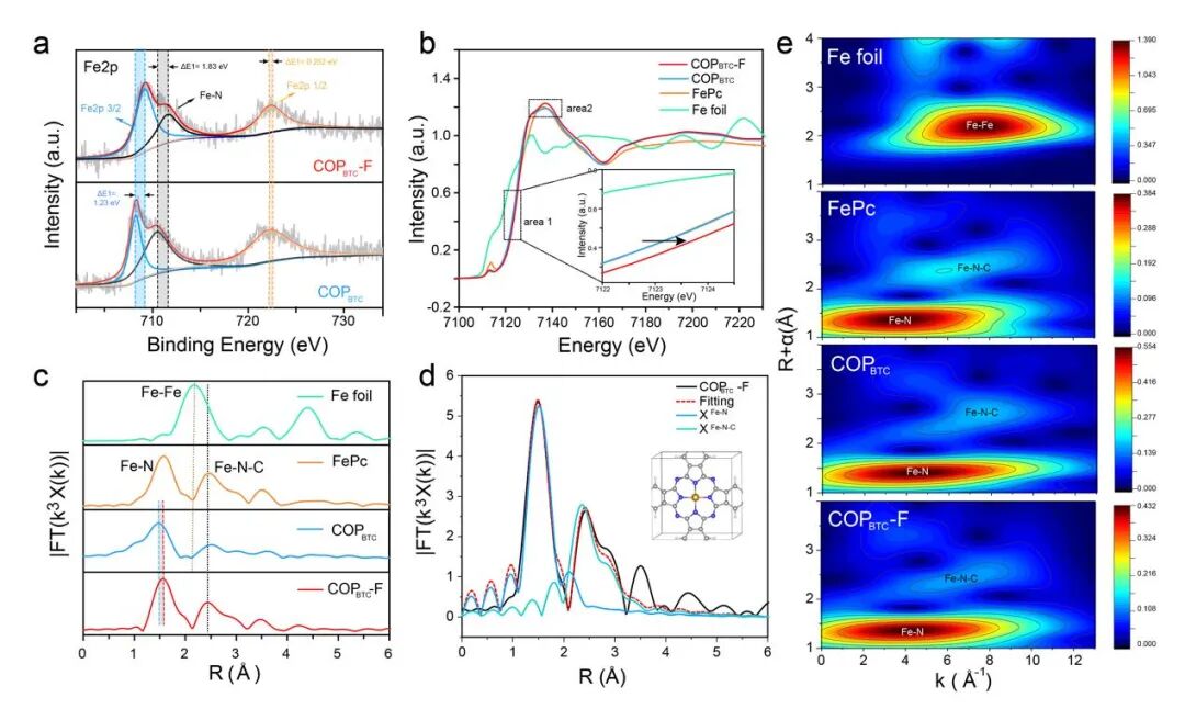 图3。铁中心分析。a)高分辨率Fe 2p XPS光谱。b) COPBTC-F、COPBTC、FePc、Fe箔的Fe k边XANES光谱。(区域1为吸收阈值;区域2为白线峰)。c) Fe箔、COPBTC、FePc、COPBTC- F的EXAFS光谱的k3加权傅里叶变换。d) R空间COPBTC-F的EXAFS分析。e) Fe箔、FePc、COPBTC、COPBTC-F的小波变换。