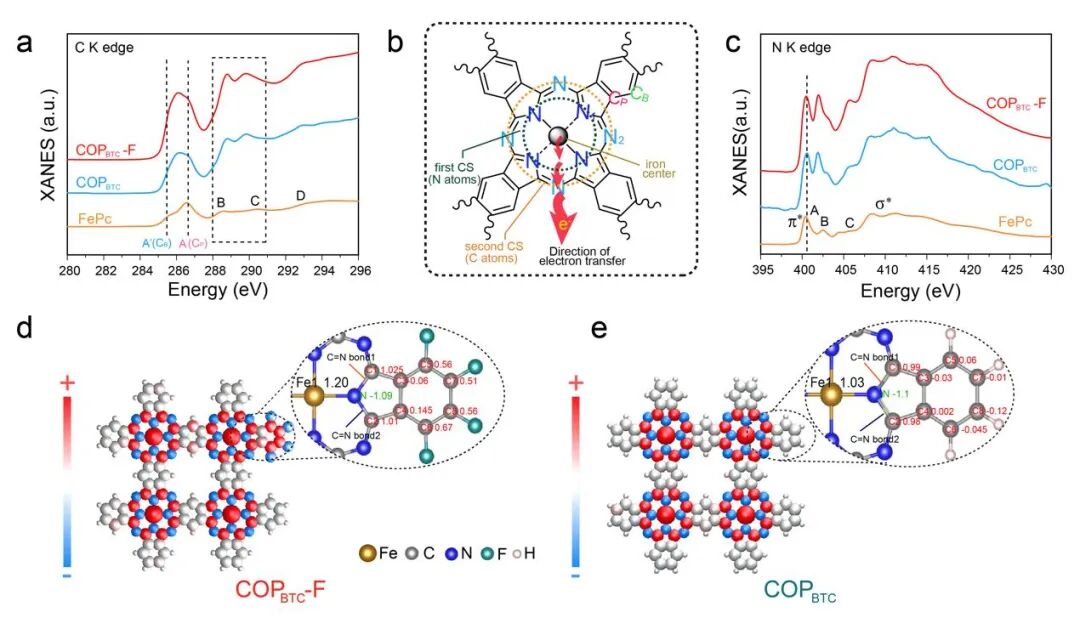 图4非金属元素的分析。a) COPBTC-F、COPBTC样品和FePc基准的C K-edge XAFS光谱。b)以FePc为构建模块的结构模型示意图。(CS代表配位球) c) COPBTC-F、COPBTC样品和FePc基准样品的N K-边XAFS光谱。d)-e) COPBTC-F和COPBTC的原子电荷密度图。原子的颜色代表它携带的电荷量。颜色越红,表示原子带的正电荷越多,颜色越蓝,表示原子带的负电荷越多。图中为模型结构示意图以及通过bader电荷布居分析得到的比电荷值。