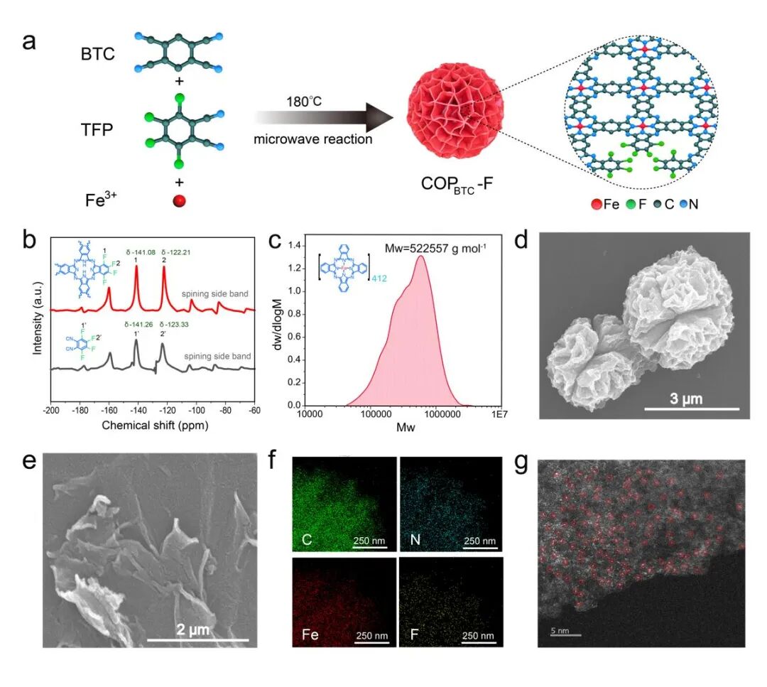 图1. 催化剂的合成及形貌表征。a) COPBTC-F合成示意图。b)合成的COPBTC-F样品和单体3,4,5,6-四氟邻苯二腈(TFP)的19F固体核磁共振(NMR)谱。c) COPBTC-F样品的凝胶渗透色谱光谱。d)-e) COPBTC-F的SEM图像。f) C, N, Fe, F mapping图像. g) COPBTC-F样品的HAADF-STEM图像。![]()