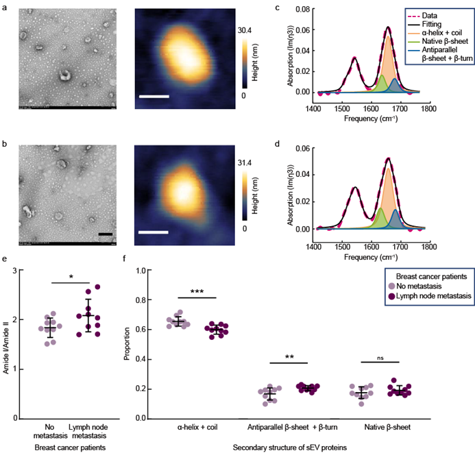 蛋白质的丰度和结构对于肿瘤的发生和发展至关重要。肿瘤相关蛋白质组成和结构的差异为阐明癌症发病机制提供了重要信息,是肿瘤诊断和药物设计的重要生物标志物。小细胞外囊泡是细胞分泌的纳米尺度(直径30–200 nm)的膜囊泡,携带和传递来源细胞的蛋白质、核酸等分子信息,影响生理病理过程。对肿瘤来源小细胞外囊泡蛋白质组分和二级结构的分析,有助于阐明小细胞外囊泡在肿瘤进展和转移中的作用,并促进肿瘤相关标志物的开发和液体活检技术的发展。