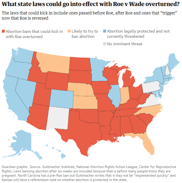 推翻“罗诉韦德案”后,堕胎权将交由美国各州自行决定。据英国卫报报道, 美国目前有20多个州可能将在“罗诉韦德案”推翻后禁止堕胎权。