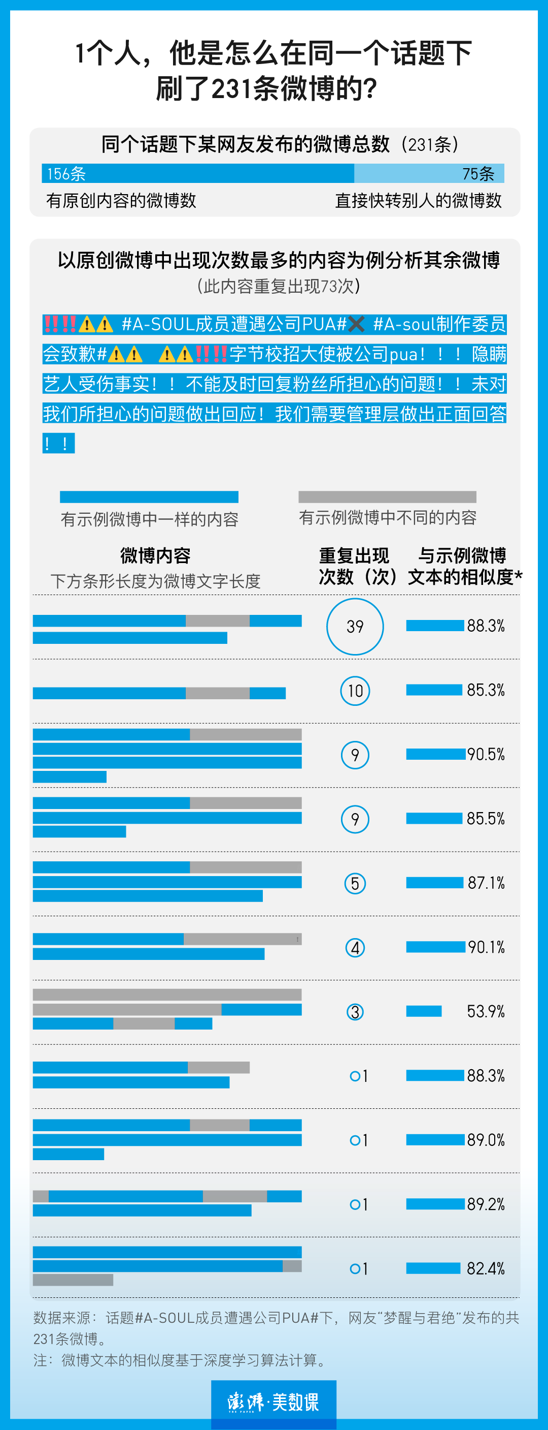 但努力的人很努力。有824人刷了50条以上,平均下来,参与话题的人,人均刷了4条。其中刷了最多条的网友叫“梦醒与君绝”,一共发了231条带话题“#A-SOUL成员遭遇公司PUA#”的微博。从他发送的微博我们可以发现,战斗的奥义就是重复、重复、再重复。