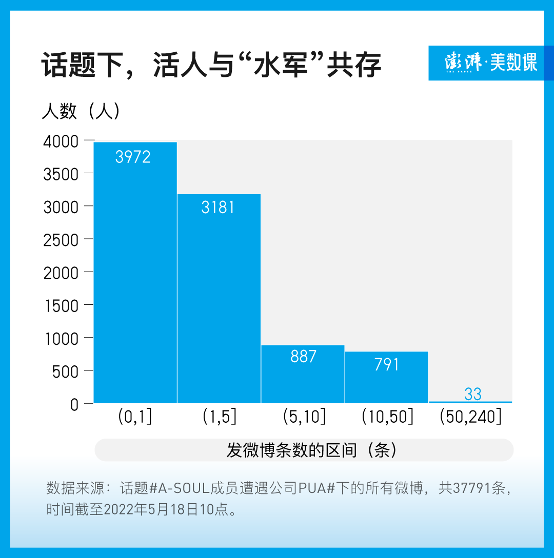 但和训练有素的“数据女工”们相比,A-SOUL刷的话题下面活人更多:只发了一条带该话题的微博的人占了约一半。
