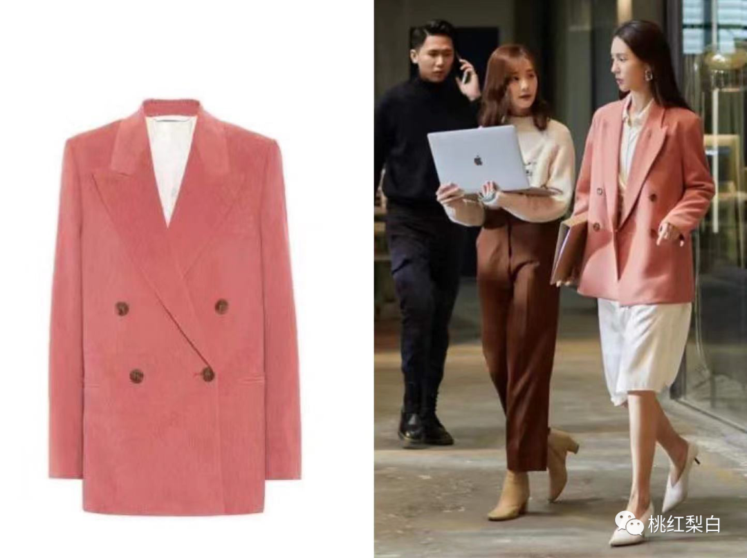 比起日常其他黑白灰的look,Acne的这件桃粉色西服x奶白色衬衫裙的选择,让她整个人看起来都变得温柔了起来。