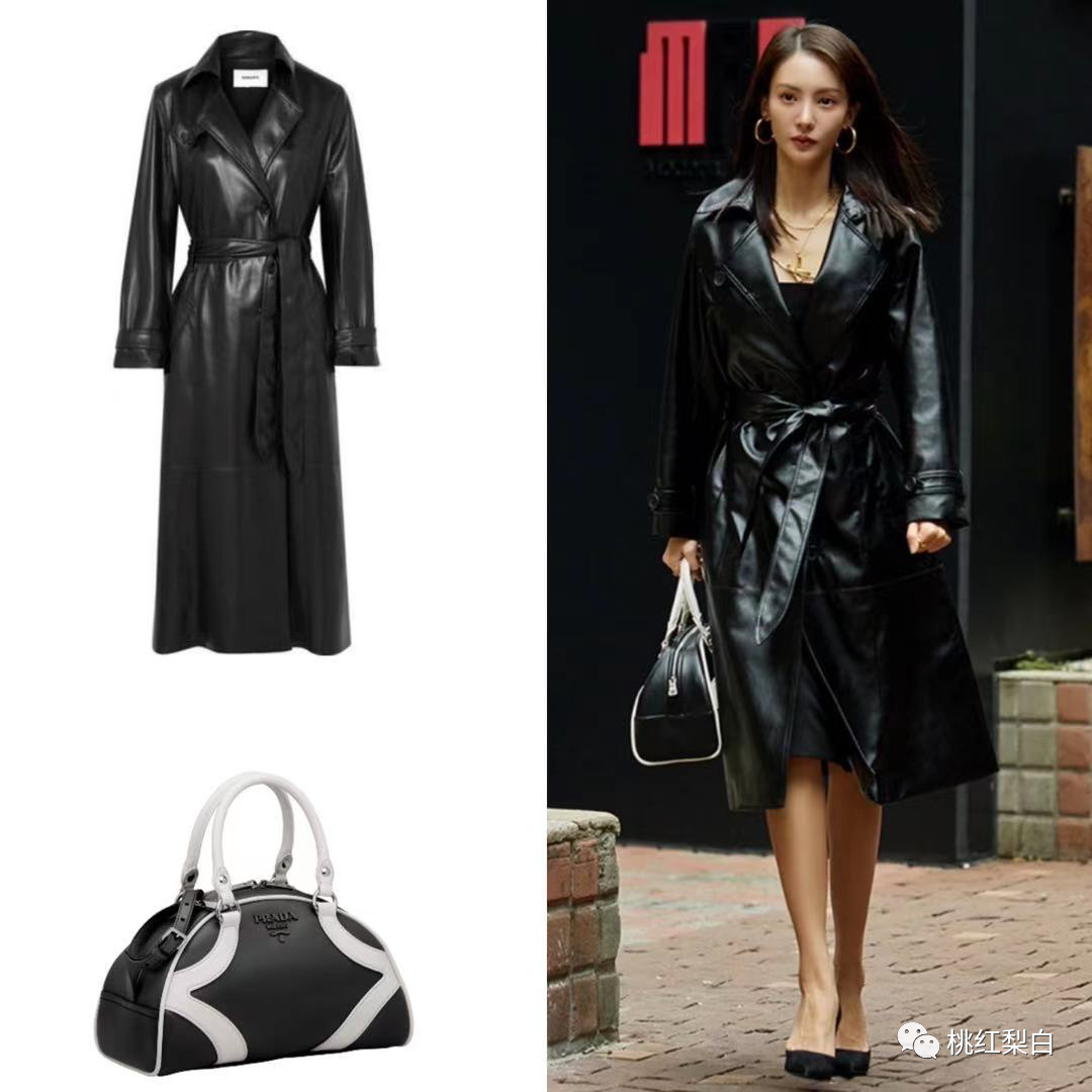 最有名的就是这件Nanushka的黑色长皮衣,系带穿成连身裙款配同色系的小高跟,手上再拎一个经典黑白款的Prada Bowling Bag,绝对的走路带风。