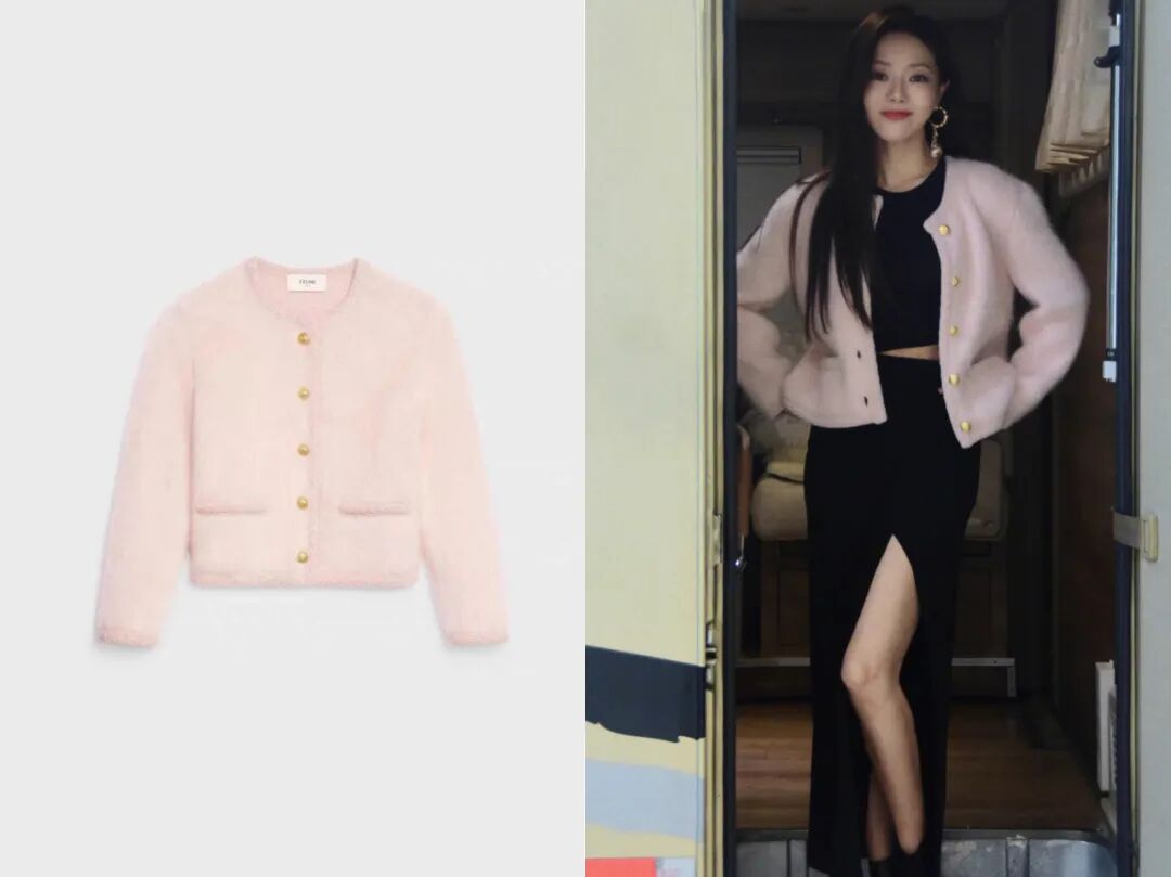 粉色短款针织开衫,内搭黑色针织裙套装,更多了些优雅女人味。