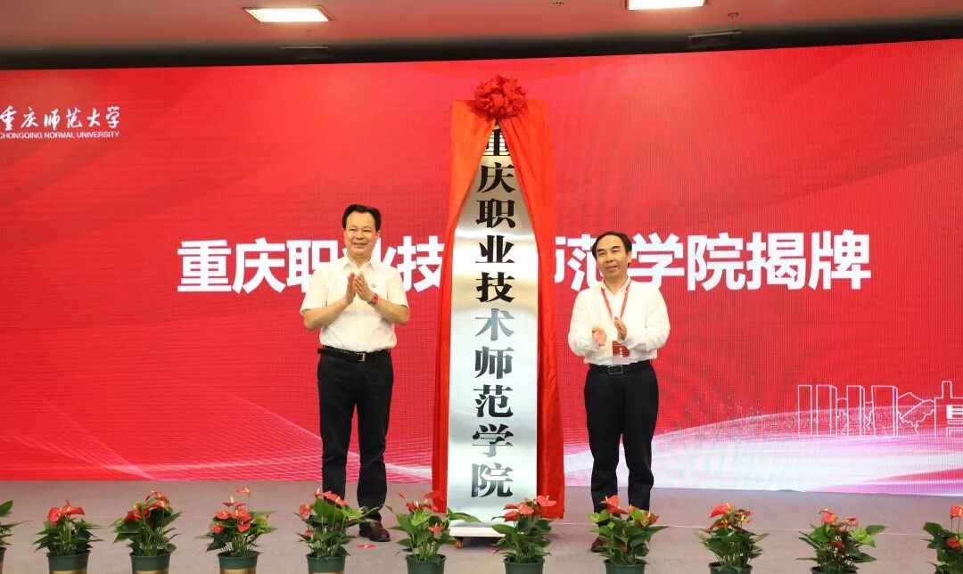 重庆师范大学党委书记曾礼宣读学校关于重庆职业技术师范学院机构设立和人事任命文件。重庆市教委一级巡视员邓睿和重庆师范大学党委书记曾礼共同为重庆职业技术师范学院揭牌。