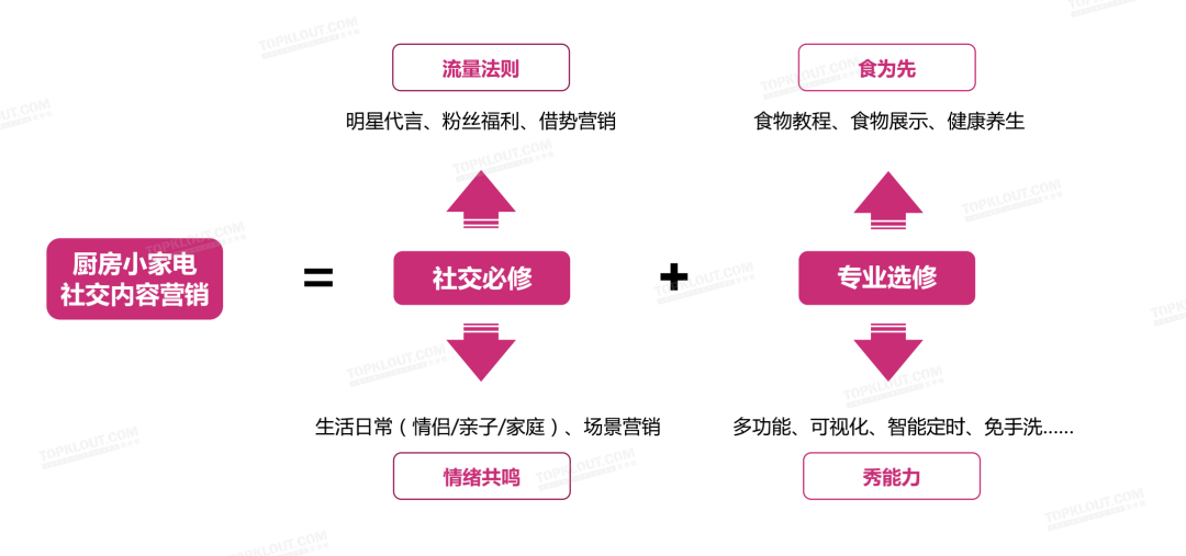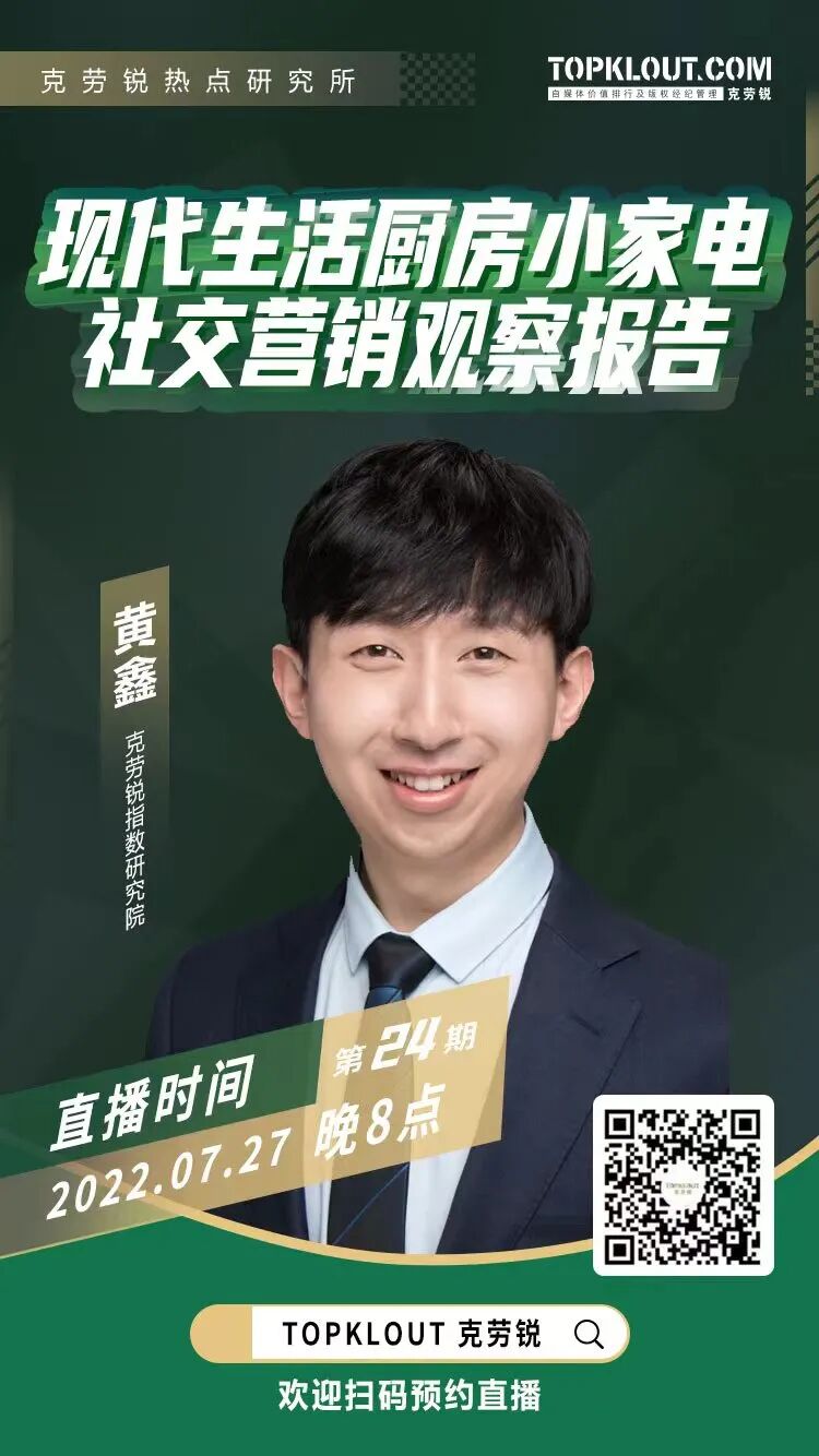 以九阳、美的、苏泊尔、小熊、山本等品牌为代表的“老牌”小家电品牌在厨房小家电领域的社交内容曝光量依然占据领先地位,也是KOL内容种草推荐提及最多的品牌类型;以志高、美菱、飞利浦、松下等品牌为代表的国内外传统电器制造企业,近年来也进军厨房小家电制造领域,围绕空气炸锅、早餐机、料理机等热门品类发展,社交平台上秒杀福利、好物推荐等内容提升了曝光量;互联网品牌基于智慧家庭架构的需求,广泛布局各项家居电器产品,小米作为代表品牌,进入社交平台厨房小家电内容曝光量TOP10品牌。食物展示是空气炸锅类产品内容种草的利器,食谱、教程聚焦食物成果展示,测评、开箱重点强化特色功能,特色功能差异化更能体现产品优势。创意饮料、养生饮品成为破壁机种草的两大重要方向,助力儿童睡眠、家务职责分配等家庭场景成为破壁机功能种草的重要切入点。从营销角度来看,代言、借势、联名、众测等成为破壁机品牌社交内容传播的主要方式。家居场景下的咖啡机内容种草场景包括但不限于整体家装风格展示、家装局部角落特写、收藏收纳等,产品与环境形成的协调统一加上仪式感能够迅速占领咖啡爱好者的心智,家居家装成为产品推荐的新模式,种草场景花样创新。整体来看,社交“必修”+专业“选修”共同构建了厨房小家电的社交内容营销,多场景的内容覆盖不断激发消费者的共鸣。通过健康饮食理念引领营销内容创作是小家电内容营销的重要特征,创意DIY内容花样层出不穷。小家电产品的种草内容逐渐由偏“硬核”的食品教程、功能测评转向偏软的情感共鸣、认知协同等,逐渐回归日常的家庭场景。小家电产品的社交内容营销主要瞄准年轻用户生活,拓展用户年龄边界。品牌会结合现代青年精致生活场景,推进产品内容营销种草,也会面向快节奏生活无暇做饭等生活现状调整产品宣传点,精准命中程序化、可预约、简单、省时等关键词布局内容营销,回归家庭场景,亲子向、情侣向、家庭团圆向内容成为情感王牌。例如飞利浦通过家庭关系与情侣日常短剧让品牌为“爱”发声,在节日节点以情感内容打动用户;小熊打造官方网红美食小百科,以年轻态定位争取青年用户……更多小家电品牌的社交营销案例分析,请在公众号后台回复“厨房小家电”领取完整版《现代生活厨房小家电社交营销观察》。报告解读直播7月27日20:00强势开启,欢迎预约!