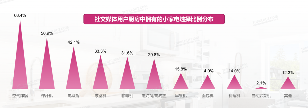 在市场需求的驱动下,小家电品牌快速发展,通过社交内容营销瞄准年轻用户生活,拓展用户年龄边界,构建了厨房小家电社交领域独特的内容营销景观。为了帮助品牌更好地挖掘年轻人在厨房小家电市场的消费喜好,洞察各大平台小家电内容营销的特征,克劳锐发布《现代生活厨房小家电社交营销观察》,为小家电品牌洞察各大品台的用户偏好、切入小家电应用及营销提供有价值的参考。近7成社交媒体用户家中厨房常备空气炸锅,丰富的制作食谱+创意延展性是社交用户重要的“神器”之一。榨汁机、破壁机、咖啡机等提升生活品质、增加生活情调,电蒸锅、电炖锅/电炖盅一键便利制作,也是社交用户的主要选择。“懒人经济”的驱动下,节约时间和提升生活质量成为用户购买厨房小家电主要动因。用户探索及购买厨房小家电主动性更强,但也不排斥接受推荐分享。自己主动搜索是用户购买厨房小家电最主要的信息来源,通过横评对比、测试等内容筛选出适合自己家用场景的产品。此外,熟人社交圈层的推荐和社交平台的内容种草,对于信息获取都有一定的推动作用,相较之下,品牌广告的效果稍显弱势。功能与需求的贴合度、实用性,成为用户购买决策的评判标准,简单的多功能叠加并不能吸引用户。品牌是影响用户购买决策的次要因素,品牌也间接反应企业的背书,与品质挂钩,厨房小家电领域形成了一定的竞争壁垒。颜值作用于成套小家电的组合搭配以及家庭厨房装修风格,由此要求品牌方不仅要有时尚的审美,还要有对家居生活的深度结合。根据克劳锐指数研究院线上调研,超过60%的用户每天至多在家一餐,基于科学饮食管理的角度,能够满足家庭快速制作的厨房小家电成为现代社会“打工人”的饮食消费新保障。开箱测评和美食内容是社交平台上提及厨房小家电最多的两大垂类。“空气炸锅”是被提及最多的关键词,其营销内容往往围绕设备、功能、美食展开。咖啡机、破壁机、料理机是社交平台上讨论厨房小家电内容的第二梯队。在功能讨论上,对于空气炸锅容量的讨论最集中,方便、简单、自动、智能等对功能的评价及可视化的特点是内容传播与讨论的焦点。基于空气炸锅的高热度,炸鸡、鸡翅、薯条、烤红薯等易上手美食讨论度高,此外牛肉、鸡蛋、牛奶、面包等健康营养早餐搭配也被反复提及。