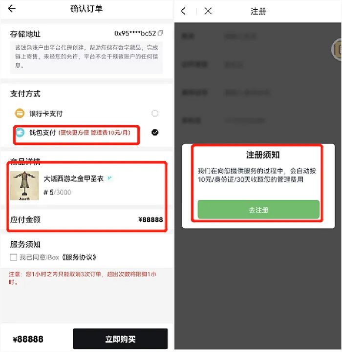 在付款和转售过程,大部分平台在完成付款的时候需要创建或者绑定钱包,运用该钱包接收所购买的数字藏品,但是如iBox代管钱包是需要收取每月10元管理费用。而在转售后,平台也会收取一定的综合服务费,还是以iBox平台为例,该平台将按照实际成交价格收取4.5%的综合服务费。