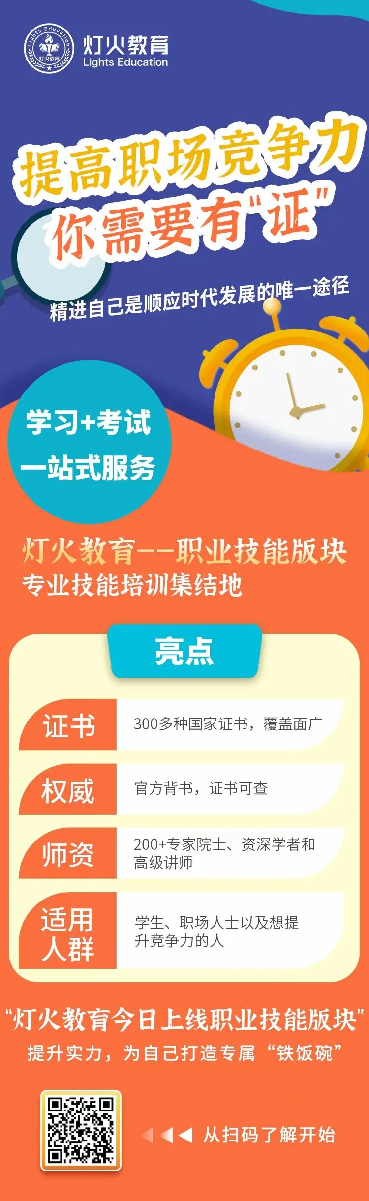 灯火教育不仅为学员提供科学严谨、全面系统、灵活有效的人才培训课程,而且还为所有学员提供“考证”的机会。灯火教育依托北京中企链云教育科技中心,将接入国家考试中心,为学员提供了获取近300种国家认可的职业技术资格证书的机会。例如,计算机网络应用、区块链应用开发工程师、网络视听主播、家庭教育指导师、金融理财师、心理健康培训师等,都是行业前景好、就业机会广阔的职业岗位。
