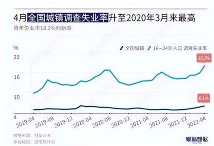 国家统计局数据:2022年4月16岁-24岁青年人失业率高达18.2%,明显高于总体6.1%的水平。