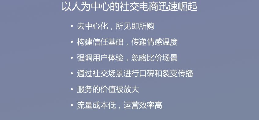 例如去年拼多多这种现象级产品的出现,再次证明了社交电商是未来最重要的一个新型创业模式。