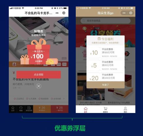 浮层优惠券:无论在小程序商城首页,还是小程序内的某个商品、活动详情页,都可以设置优惠券浮层,强力引导用户领取优惠券。