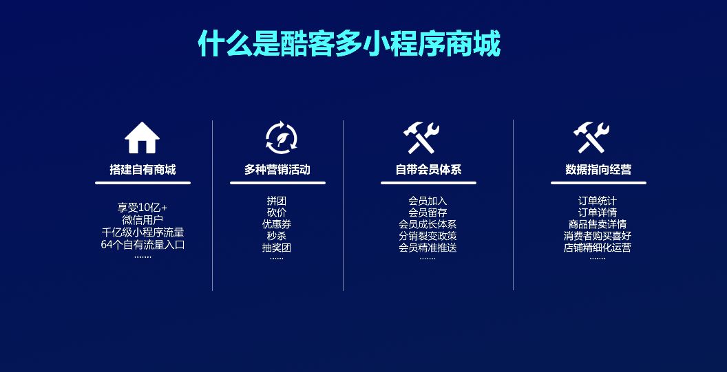 酷客多小程序运营商打造了一条全面的从拓客——粉丝沉淀——会员成交——二次裂变的全生态的链条服务。