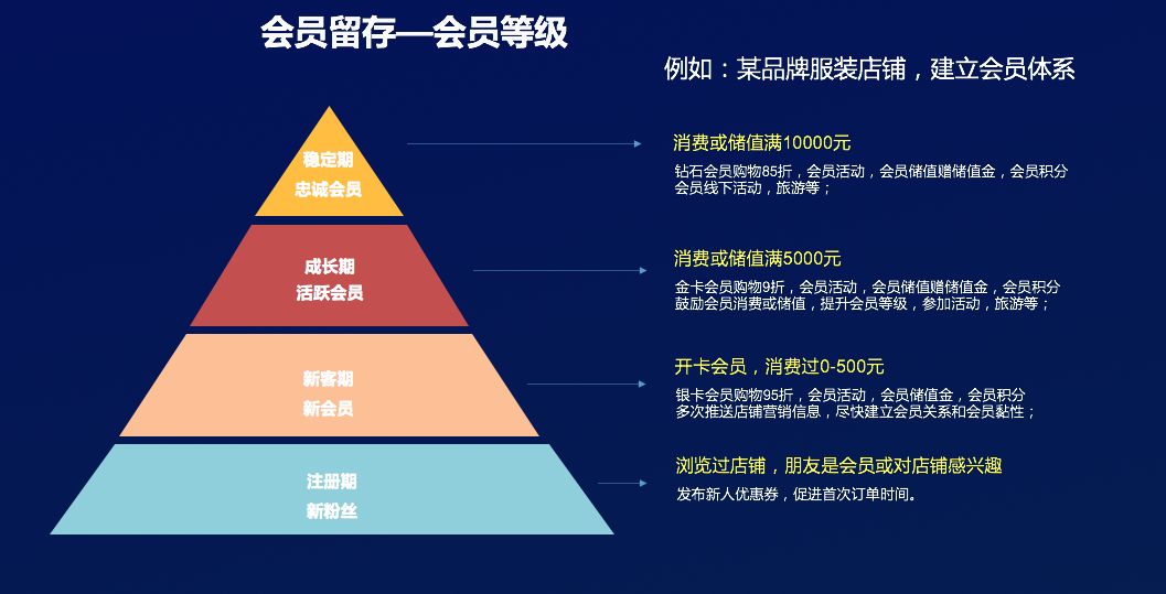 或者在同一个“满100减20”活动当中,系统会对用户等级进行划分,比如老用户,可以享受到8折优惠;钻石会员,可以享受6折优惠,通过会员组织、会员级别来完成用户留存。