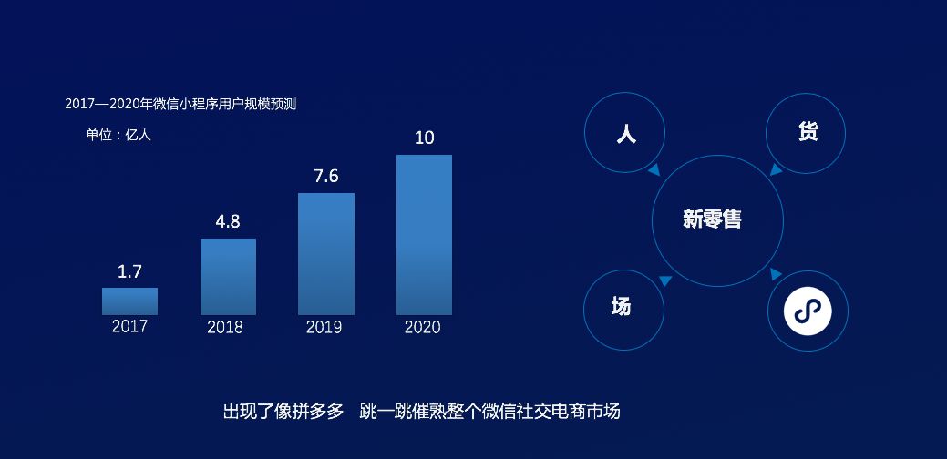 第一,微信最新的月度活跃用户已达10亿,而微信小程序是依托于整个微信大的生态背景环境下得到阶段性的活跃发展。