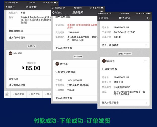 下单成功通知、快递发货通知、物流进展通知、拼单发起/成功通知等等。