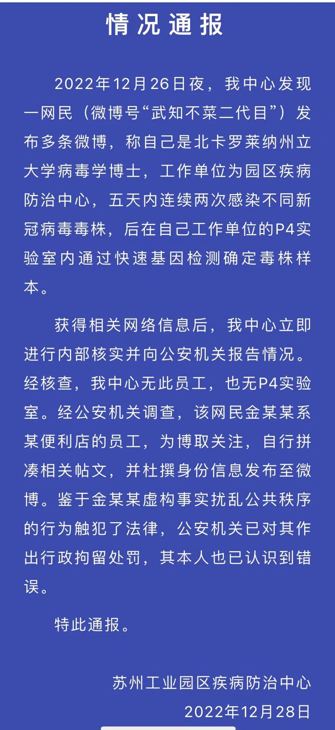获得相关网络信息后,园区疾病防治中心立即进行内部核实并向公安机关报告情况。经核查,苏州工业园区疾病防治中心无此员工,也无P4实验室。经公安机关调查,该网民金某某系某便利店的员工,为博取关注,自行拼凑相关帖文,并杜撰身份信息发布至微博。鉴于金某某虚构事实扰乱公共秩序的行为触犯了法律,公安机关已对其作出行政拘留处罚,其本人也已认识到错误。