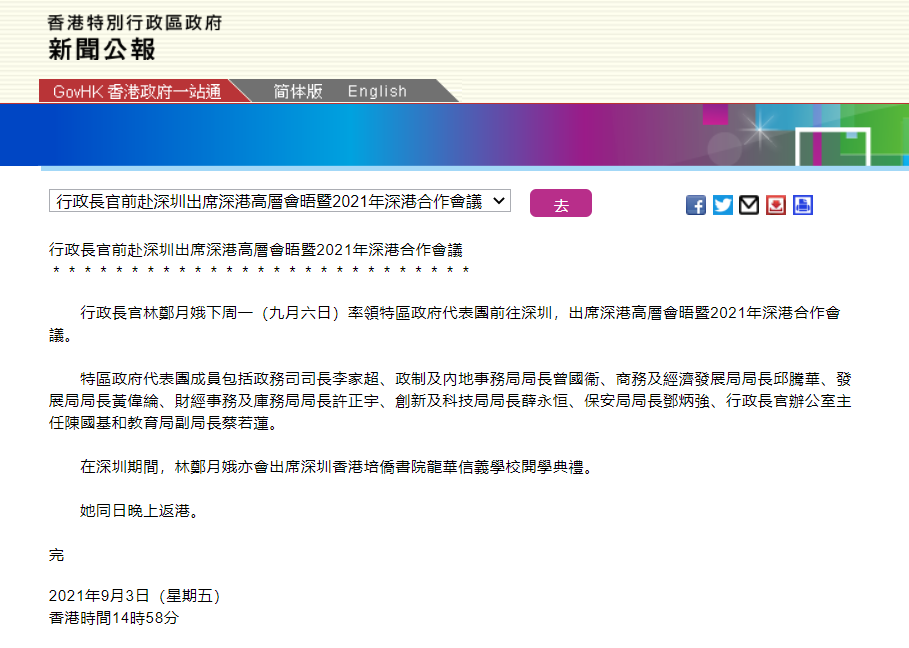 据特区政府今天发布的消息,特区行政长官林郑月娥下周一(9月6日)将率领特区政府代表团赴深圳,出席深港高层会晤暨2021年深港合作会议。