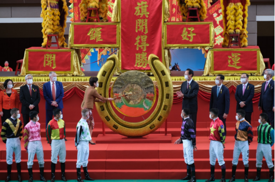 新马季今日(5日)在沙田马场正式开锣,行政长官林郑月娥到场主持仪式,为醒狮点晴及敲锣。时隔一年,马迷终可在开锣日透过预约进场,不少马迷在中午前已陆续到场,并在进场时大力敲打铜锣,希望在新马季可以丰收。