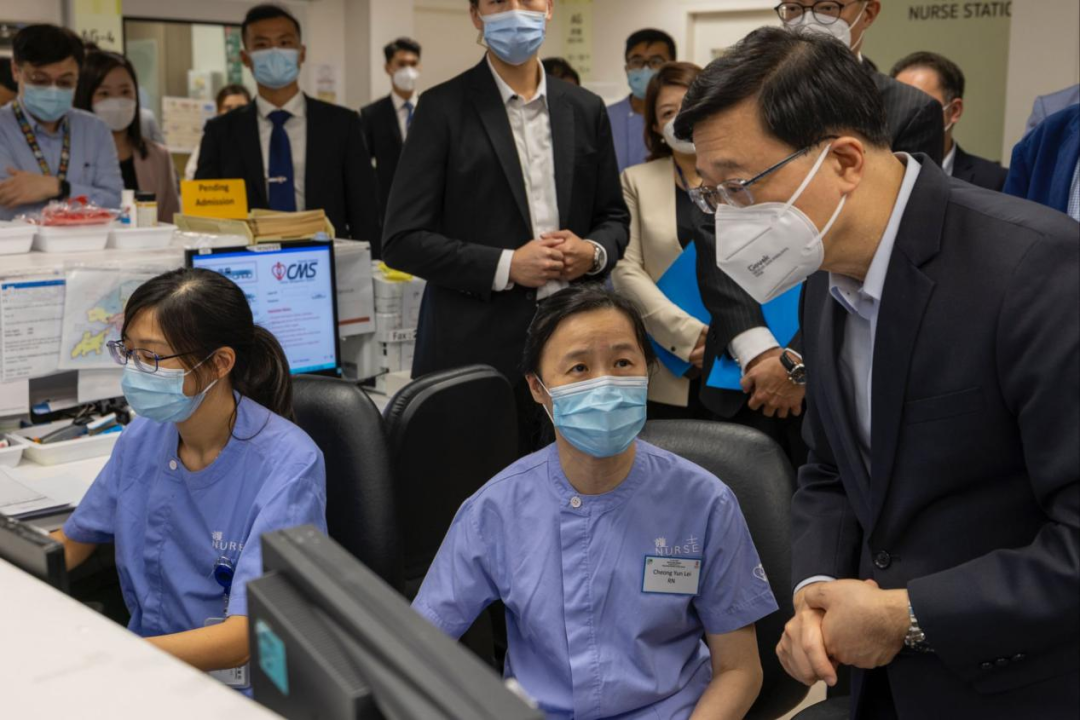 李家超强调在到访期间和不同医护人员倾谈,表示他们勇于面对挑战,克服困难,保护市民生命和健康。他衷心感谢他们的努力和贡献,并代表政府及广大市民向他们致敬,他们的专业和无私精神是香港的骄傲!