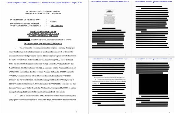 当地时间周五(26日),美国司法部公开了申请搜查前总统特朗普住所的宣誓书,当中提到,联邦调查局在特朗普私人庄园内搜出的箱子中发现了184份机密文件。
