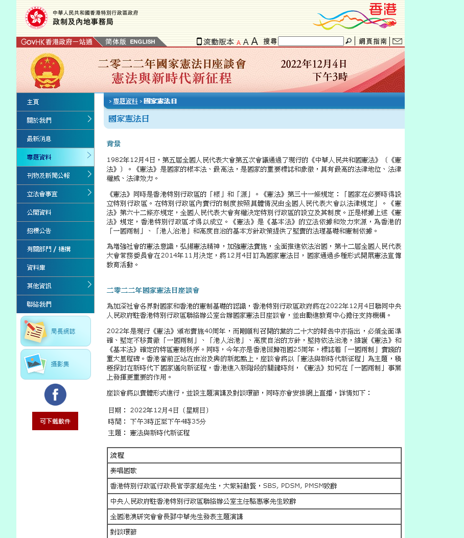据香港媒体今日(29日)的报道,12月4日是国家宪法日,为加深社会各界对国家和香港的宪制基础的认识,特区政府将联同中联办合办座谈会,主题为“宪法与新时代新征程”。座谈会将于当日下午在湾仔会展中心举行,据悉行政长官李家超、香港中联办主任骆惠宁将分别致辞,全国港澳研究会会长邓中华将发表主题演讲。