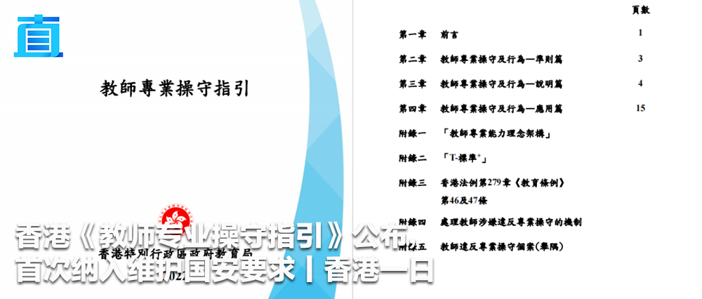 特区政府教育局15日公布《教师专业操守指引》,包括“专业信念”、“恪守法治”、“以身作则”、“廉洁公正”、“尽忠职守”、“关爱学生”、“尊重私隐”和“维护专业”共8项教师专业操守准则。指引首次把“维护国家安全和社会秩序”纳入要求,具体在“恪守法治”的准则中,包括“正确理解《宪法》、《基本法》和《香港国安法》及相关法例”,“培养学生正确的国家观念、国民身份认同和民族感情”等内容。