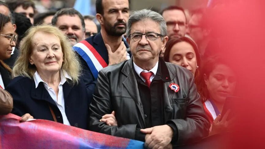 ▲ “不屈的法兰西”党魁梅朗雄(右)和今年诺贝尔文学奖得主,法国作家安妮·埃尔诺(左)在游行现场。(法新社图)