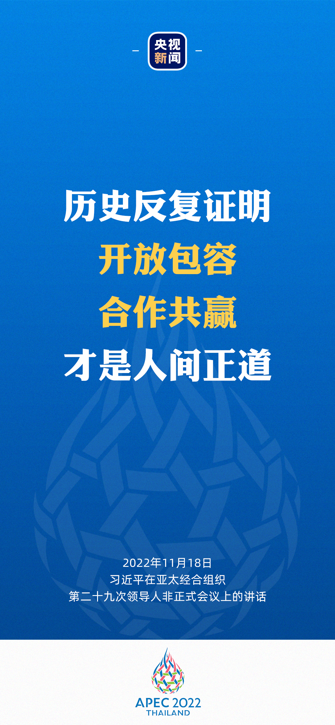 上个月,中国共产党第二十次全国代表大会成功举行,为当前和今后一个时期中国发展指明了方向、规划了蓝图。中国愿同所有国家在相互尊重、平等互利的基础上和平共处、共同发展。中国将坚持实施更大范围、更宽领域、更深层次对外开放,坚持走中国式现代化道路,建设更高水平开放型经济新体制,继续同世界特别是亚太分享中国发展的机遇。