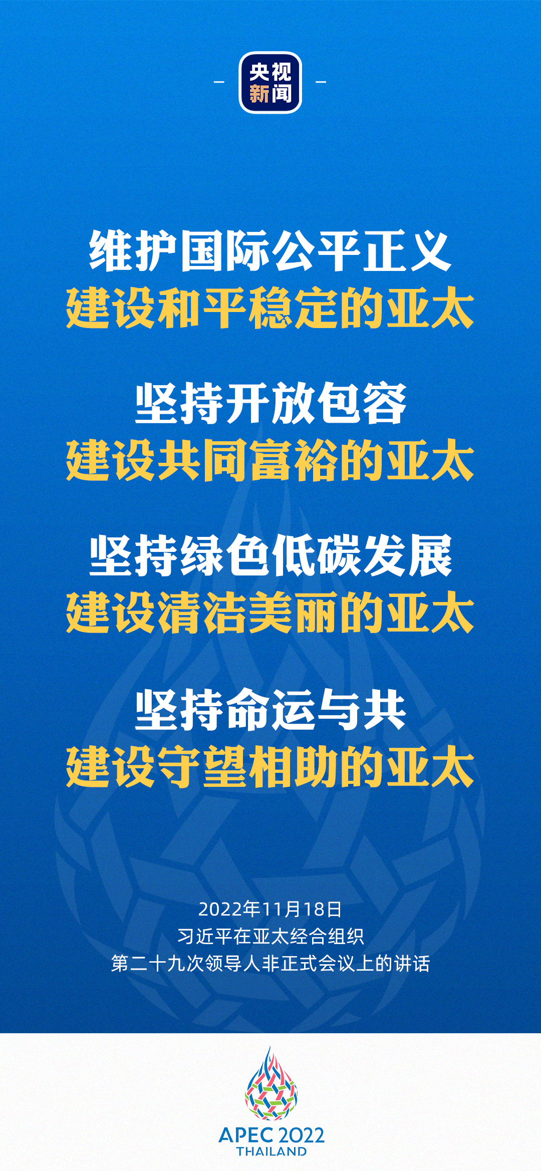 第一,维护国际公平正义,建设和平稳定的亚太。亚太过去几十年经济快速增长,得益于和平稳定的环境。一个重要启示就是相互尊重、团结合作,遇到事情大家商量着办,寻求最大公约数。我们应该坚持共同、综合、合作、可持续的安全观,尊重各国主权、领土完整,不干涉别国内政,尊重各国人民自主选择的发展道路和社会制度,重视各国合理安全关切,通过对话协商以和平方式解决国家间的分歧和争端。我们要积极参与全球治理,推动国际秩序朝着更加公正合理的方向发展,为亚太和世界和平稳定提供保障。