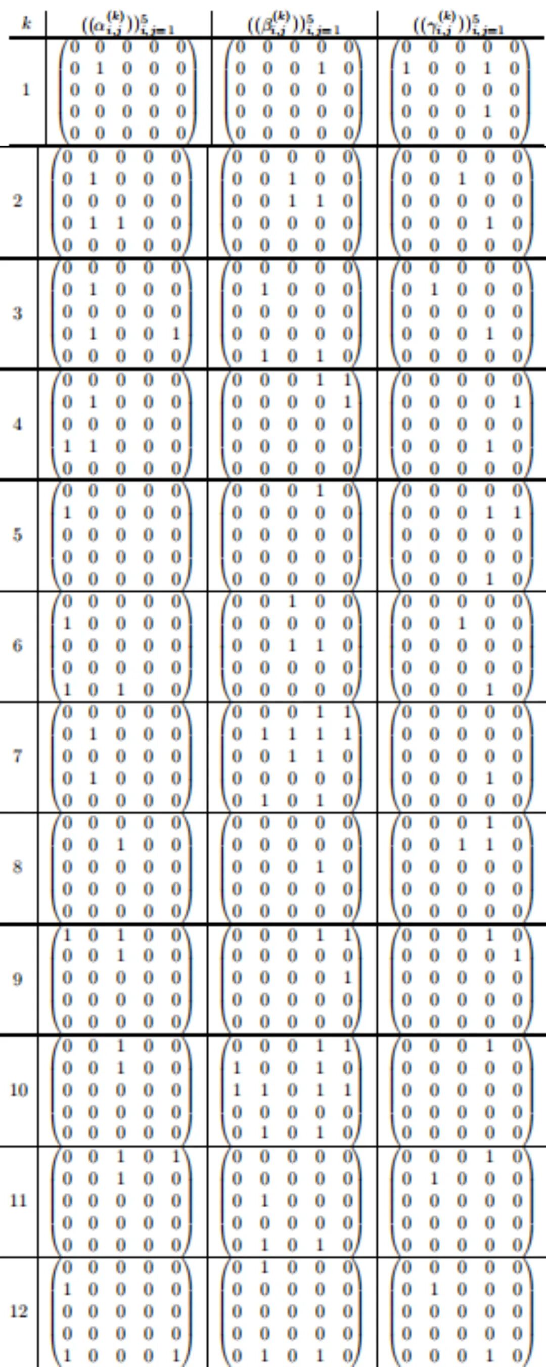5×5 矩阵(n=5)的 95 步乘法方案如下: