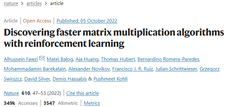 10 月 5 日,AlphaTensor 横空出世,DeepMind 宣布其解决了数学领域 50 年来一个悬而未决的数学算法问题,即矩阵乘法。AlphaTensor 成为首个用于为矩阵乘法等数学问题发现新颖、高效且可证明正确的算法的 AI 系统。论文《Discovering faster matrix multiplication algorithms with reinforcement learning》也登上了 Nature 封面。