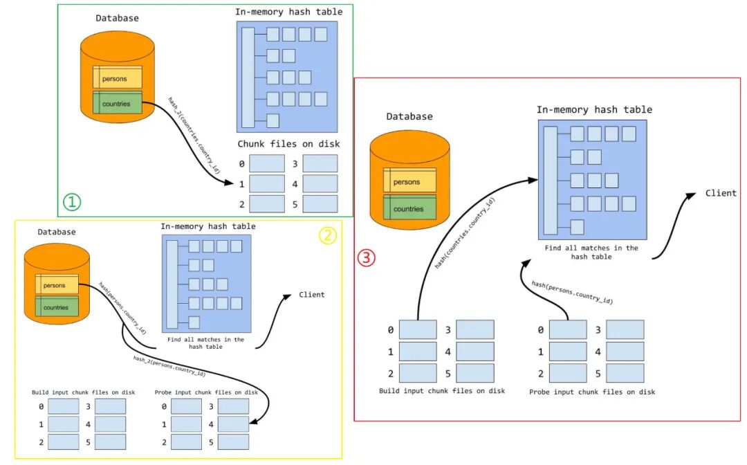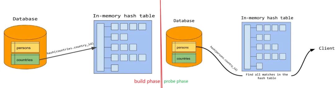 on persons.country_id = countries.country_id;如上查询的构建阶段和探测阶段图示如下: