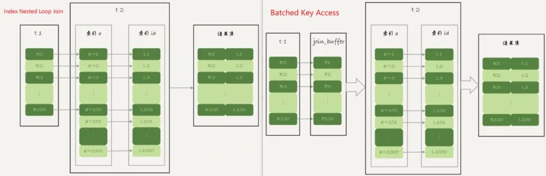 Batched Key Accesss(BKA)算法,是对INLJ(Index Nested Loop Join) 算法的优化。INLJ的逻辑是,从驱动表t1,一行行取出a的值,再到被驱动表t2做join,对于表t2来说,每次都是匹配一个值,这样效率不高,回想BNLJ中我们将驱动表加载到join_buffer中,就能利用MRR2, 一起传给t2,从而达到匹配多个值的目标。